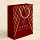 Élevez vos cadeaux d'entreprise avec ce modèle élégant de sac de cadeaux de vacances d'entreprise avec un fond rouge festif et un design d'arbre de Noël géométrique en faux or, votre logo d'entreprise au centre et un texte personnalisé.
