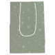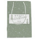 Sac cadeau de Noël moderne et personnalisé avec de mignons arbres de Noël abstraits et arbres de la forêt et motifs de neige d'hiver dans les tons sauge, vert et blanc avec l'accueil MERRY CHRISTMAS en écriture manuscrite avec votre nom ou texte personnalisé. L'échantillon est indiqué dans la taille MOYENNE, d'autres tailles sont disponibles sur la page de commande. ASSISTANCE : Pour obtenir de l'aide sur la modification ou la personnalisation de la conception, le changement de couleur, le redimensionnement ou le transfert de la conception à un autre produit, contactez le concepteur AVANT DE COMMANDER via l'onglet MESSAGE Conversation Zazzle ci-dessous ou envoyez un courriel à makeitaboutyoustore@gmail.com.