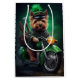 Un ami en fureur derrière les guidons d'une moto verte brillante, portant une tenue verte de la Saint Patrick qui fait tourner la tête. Le chien est habillé d'un ensemble festif, avec une cravate arc-en-ciel verte et un chapeau haut assorti qui se trouve doucement au-dessus de la tête. Le costume présente des motifs complexes de shamrocks et de leprechauns, ce qui indique clairement que ce chien est prêt à célébrer la Saint Patrick avec style.
