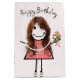 Jolie figurine en bâton avec cheveux et un bouquet de fleurs en basket et une robe en vichy rouge et blanc sur arrière - plan blanc. La couleur Arrière - plan peut être modifiée. Le texte "Joyeux anniversaire" est modifiable.