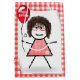 Stick girl avec ballon rouge, robe en vichy, cheveux et lunettes rouges sur papier recouvert blanc arrière - plan pour anniversaire Texte sur ballon peut être modifié ou supprimé.