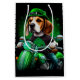 Un ami en fureur derrière les guidons d'une moto verte brillante, portant une tenue verte de la Saint Patrick qui fait tourner la tête. Le chien est habillé d'un ensemble festif, avec une cravate arc-en-ciel verte et un chapeau haut assorti qui se trouve doucement au-dessus de la tête. Le costume présente des motifs complexes de shamrocks et de leprechauns, ce qui indique clairement que ce chien est prêt à célébrer la Saint Patrick avec style.