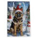 Ce design festif reflète l'esprit joyeux de la période des fêtes, avec un adorable petit portant un chapeau de Père Noël. Le chien est niché dans un pays des merveilles hivernales, avec un bonhomme de neige, un sapin de Noël décoré et des cadeaux joliment emballés. Les flocons de neige tombent doucement, ajoutant une touche magique à la scène, tandis que les couleurs vives des décorations de vacances créent une atmosphère chaleureuse et joyeuse.