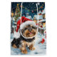 Ce design festif reflète l'esprit joyeux de la période des fêtes, avec un adorable petit portant un chapeau de Père Noël. Le chien est niché dans un pays des merveilles hivernales, avec un bonhomme de neige, un sapin de Noël décoré et des cadeaux joliment emballés. Les flocons de neige tombent doucement, ajoutant une touche magique à la scène, tandis que les couleurs vives des décorations de vacances créent une atmosphère chaleureuse et joyeuse.