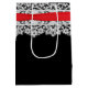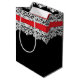 Arc rouge sur dentelle blanche avec étiquette cadeau sur arrière - plan noir. Le texte est modifiable.