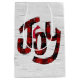 Le casquette du Père Noël sur le buffle rouge et noir plaid JOY dans un style de police amusant sur l'arrière - plan de bouleau blanc avec des flocons de neige.