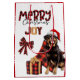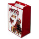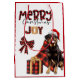L'image sur ce sac cadeau de Noël est celle d'un chien Rottweiler portant un chapeau de Père Noël rouge et blanc, avec un coussin de buffle noir et rouge derrière lui, et d'un cadeau de coordination avec un ruban d'or à côté de lui. Il y a aussi un arc en plaid de buffle et le texte correspondant qui dit "JOY". Stylisé rouge et noir buffle texte plaid dit MERRY CHRISTMAS". Les deux côtés du sac ont la même image, avec les côtés et la doublure correspondant rouge.