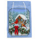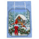 Une paire de Cardinaux rouges du Nord se perche sur une palissade blanche recouverte de neige, ornée d'une guirlande de Noël et d'un arc rouge vif. Ils se régalent d'une mangeoire d'oiseaux d'hiver décorée de cloches de Noël, de rubans et de saints. Oeuvre réaliste créée par l'artiste faunique Crista S. Forest.
