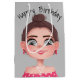Jolie fille de dessin animé avec de grands yeux sur un arrière - plan gris et un texte d'anniversaire heureux. Le texte est modifiable ou peut être supprimé. La couleur Arrière - plan peut être modifiée.
