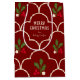 Offrez un cadeau vraiment personnalisé en cette saison de Noël avec un sac cadeau personnalisé. Customisez le message d'accueil et le nom, le texte et sautez les étiquettes cadeaux puisque l'information est déjà sur ce papier décoratif saisonnier. Un motif d'élégantes arches rouges à pétoncles est accentué par des sprigs illustrés de feuilles saints et de baies et une fleur blanche crémeuse sur un arrière - plan de rouge bordeaux riche.