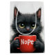 Un chaton noir moelleux aux grands yeux verts tient une tasse rouge vif étiquetée "Nope". Le texte peut être modifié.