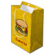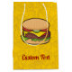 Illustration de dessin animé Cheeseburger. Arrière - plan de motif de malbouffe jaune. Texte personnalisé des deux côtés.