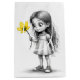 Un croquis d'une jeune fille aux cheveux longs tenant une fleur jaune tout en la regardant avec une merveille aux yeux larges sur le blanc. Le texte peut être modifié.