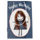 Baguette fille avec cheveux longs rouges, basket, robe denim bleu, collier de perle sur arrière - plan denim bleu. Le texte de Joyeux Anniversaire peut être modifié.