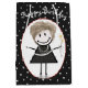 Jolie figurine en bâton avec cheveux, baskets, robe pois de pois, et bouquet de marguerite sur motif pois noir et blanc. Le texte est modifiable.