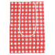 Baguette fille avec cheveux, baskets, robe en vichy, collier de perle sur un motif en vichy rouge et blanc. Le texte de Joyeux Anniversaire peut être modifié.