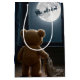 A teddy bear gazes out the window at the full moon, with Santa's sleigh silhouetted against the night sky, as the softly lit room creates a cozy and magical atmosphere.
