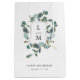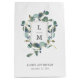 Ce simple et tendance sac cadeau de bienvenue mariage ou de remerciement vous propose des feuilles d'eucalyptus vert aquarelle entourant une crête avec vos monogrammes au centre, sur un arrière - plan blanc propre.