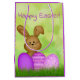 Make Easter egg-stra magical with this cute, colorful Easter gift bag featuring a sweet smiling cartoon bunny rabbit and purple Easter eggs on a grassy green background. Bag sides are purple. Perfect for kids, the bag reads "Happy Easter!" Design repeats on bag reverse. A fun touch for your holiday gifting.