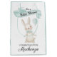 Ce sac cadeau baby shower personnalisé a un thème simple et sucré pour enfants farci. Un joli jouet farci de lapin, avec une petite cravate, est représenté au centre tenant un ballon de couleur turquoise pastel. Une bannière turquoise assortie au-dessus du lapin comporte le texte "Baby shower", avec le nom de l'invité honoré imprimé dans la partie inférieure.