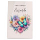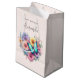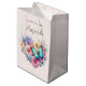 Gift bag with a beautiful illustration. A heart-shaped bouquet of flowers in pastel blue, green, purple and yellow. With a lovely blue butterfly hovering in front.