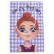 Jolie fille de dessin animé avec de gros boucles d'oreilles et les yeux sur en vichy violet motif avec Happy Birthday texte. Le texte est modifiable ou peut être supprimé.