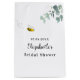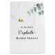 Un fond blanc chic. Décoré avec de la verdure d'eucalyptus aquarellée, du feuillage et une abeille mignonne et souriante. Personnalisez et ajoutez le nom de la mariée à l'abeille et une date. Le nom est écrit avec un style de lettrage moderne à la main.
