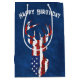 Une silhouette de cerf avec un drapeau américain sur arrière - plan en cuir bleu pour l'anniversaire. Le texte est modifiable.