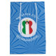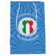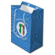 Un sac cadeau moyen montre un ange portant le drapeau de l'Italie pour la décoration cadeau de vacances ou Hanoukka. L'ange du drapeau italien se trouve à l'intérieur d'une fractale circulaire blanche de carrés grossiers. L'arrière - plan est une fractale bleue de carrés grossiers. Ajoutez votre propre texte ou personnalisez avec un nom et l'année. Le drapeau est un tricolore vertical à rayures rouges, blanches et vertes. On l'appelle souvent IL TRICOLORE.