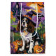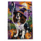 Embrassez l'esprit d'Halloween avec ce design enchanteur avec un chien mignon dans un casquette sorcier entouré de citrouilles sculptés. Parfait pour ajouter une touche de charme éffrayant à vos célébrations festives.