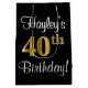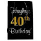 Ce design élégant, luxueux et sophistiqué sur le thème de l'anniversaire comprend le numéro ordinal "40th" ayant une grande apparence fausse/imitation or, en plus d'un message de voeux d'anniversaire et un nom de destinataire personnalisé dans une police de style script. L'arrière - plan est noir de couleur. Un sac-cadeau à thème d’anniversaire comme celui-ci peut être utilisé pour donner un cadeau ou un cadeau pour célébrer le 40e anniversaire de quelqu’un. [~Z0000513]