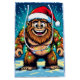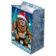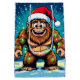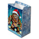 A funny Bigfoot Christmas gift bag with a comic book style pop art sasquatch smiling with a Santa and Christmas lights on.