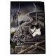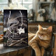 Le chaton tuxedo noir et blanc est assis à côté d'une gargouille. Derrière eux se trouve un château et des dragons.