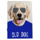 Golden Retriever chien avec t-shirt bleu et lunettes de soleil d'aviateur pour l'anniversaire. Le texte est modifiable. Arrière - plan peut être modifié.