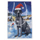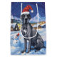 Ce design festif reflète l'esprit joyeux de la période des fêtes, avec un adorable petit portant un chapeau de Père Noël. Le chien est niché dans un pays des merveilles hivernales, avec un bonhomme de neige, un sapin de Noël décoré et des cadeaux joliment emballés. Les flocons de neige tombent doucement, ajoutant une touche magique à la scène, tandis que les couleurs vives des décorations de vacances créent une atmosphère chaleureuse et joyeuse.