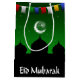 Illustration de salutation d'Eid Mubarak avec une guirlande de fête et colorée dans une scène magique de nuit avec une silhouette de mosquée et la lune et les étoiles sur un ciel nocturne vert.