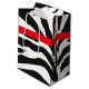 Sac cadeau laqué moyen avec une image de zèbre imprimé et un ruban rouge, arc rouge et le charme zèbre doré en option. Voir le grand sac cadeau assorti. Voir l'ensemble de la collection de sacs-cadeaux Safari dans les TOUCHES SPÉCIALES | Section Favoris.