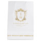Sac cadeau mariage design avec une élégante crête mariage en or et des initiales personnalisées. La typographie or est personnalisable sur un arrière - plan blanc.