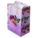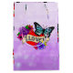 Joli sac cadeau romantique pour un cadeau de Saint Valentin, Anniversaire ou Anniversaire. Tatouage style graffiti texte et coeur enveloppé de fleurs violettes et un papillon bleu.