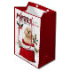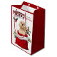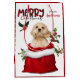 L'image à l'avant et à l'arrière de ce sac cadeau de Noël est l'image d'un mignon chien blanc Cocker Spaniel qui sort d'un sac cadeau de Noël. Derrière lui se trouve une branche de baies saintes et rouges. Un bullfinch rouge et noir est sur le point d'atterrir. Stylisé rouge et noir buffle texte plaid dit MERRY CHRISTMAS". Votre propre signature est dans deux champs pour vous de customiser. Assurez-vous de voir les produits correspondants, y compris les ornements, dans notre magasin.
