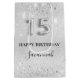 Elégant, classique, glamour et girly pour une Quinceañera, 15ème anniversaire. Un arrière - plan métallique argenté. Décoré de poussière de parties scintillant. Personnalisez et ajoutez un nom. Avec le texte : Joyeux anniversaire. Le nom est écrit avec un script de style moderne écrit à la main. Le numéro 15 est écrit avec une police de style ballon.