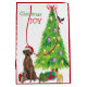 De chaque côté de ce sac cadeau de vacances, un mignon chiot Labrador Retriever au chocolat porte un chapeau de Père Noël tandis qu'il est assis à côté d'un arbre de Noël. Autour du chien, des paquets cadeaux aux enveloppements éclatants sont éparpillés. Un bullfinch atterrit sur le sapin de Noël. Le texte rouge et vert dit "JOIE DE Noël".
