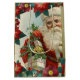 Vintage illustration of Santa Claus bringing toxicts and presents for Christmas, decorated with holly berries and poinsettias.