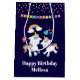 Sac cadeau d'anniversaire avec 2 licornes dansantes mignonnes avec des queues et une crinière brillantes et colorées. Un arc-en-ciel coloré avec des nuages de chaque côté au-dessus de leurs têtes. D'autres éléments incluent une petite fleur, un cœur et quelques étoiles. Fond violet foncé. Points de confettis colorés et une image de bannière en haut.
