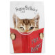 Tabby cat reading red mice recipe book on white background for birthday. Background color and text can be change d.