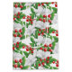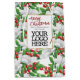 Conception de sac cadeau de Noël personnalisable avec un bouquet d'hiver coloré avec des fleurs blanches, des baies rouges et des éléments botaniques verts vifs, sur fond blanc personnalisable. Calligraphie moderne de Noël joyeux en rouge. Œuvre originale par Suki, tous droits réservés.