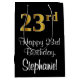 Ce design élégant, sophistiqué et luxueux de sac cadeau d'anniversaire comporte un grand numéro ordinal "23ème" avec une imitation/faux look or, en plus du message de voeux d'anniversaire "Happy 23ème anniversaire", et un nom de destinataire personnalisé dans une police de style script. L'arrière - plan est noir de couleur. Un sac-cadeau à thème d’anniversaire comme celui-ci pourrait être une façon amusante d’envelopper un cadeau ou un cadeau pour célébrer le vingt-troisième anniversaire de quelqu’un. [~Z0000514]