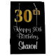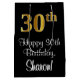 Ce design élégant, luxueux et sophistiqué de sac cadeau d'anniversaire comprend un grand numéro ordinal "30e" ayant une apparence imitation/faux or, en plus du message de voeux d'anniversaire "Happy 30th Birthday", et un nom de destinataire personnalisable dans une police de style script. Il dispose également d'une arrière - plan de couleur noire. Un sac-cadeau comme celui-ci peut être une façon amusante d'envelopper un cadeau d'anniversaire ou un cadeau donné à quelqu'un qui célèbre son trentième anniversaire. [~Z0000514]