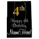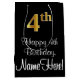 Cette conception sophistiquée, élégante et élégante de sac cadeau d'anniversaire comporte un grand numéro ordinal "4th" ayant une imitation/fausse apparence or, en plus du message de voeux d'anniversaire "Happy 4th Birthday," et un nom de destinataire personnalisé dans une police de style script. L'arrière - plan est noir de couleur. Un sac-cadeau élégant à thème d’anniversaire comme celui-ci peut être utilisé pour donner un cadeau ou un cadeau pour célébrer le 4e anniversaire de quelqu’un. [~Z0000514]