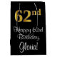 Ce design luxueux, élégant et élégant de giftbag d'anniversaire comprend un grand numéro ordinal "62nd" avec une imitation/faux look d'inspiration or, avec le message de voeux d'anniversaire "Happy 62nd Birthday," et un nom de destinataire modifiable dans une police de style script. L'arrière - plan est noir de couleur. Un sac cadeau d’anniversaire de luxe comme celui-ci pourrait être une façon amusante d’envelopper un cadeau ou un cadeau pour célébrer le 62e anniversaire de quelqu’un. [~Z0000514]